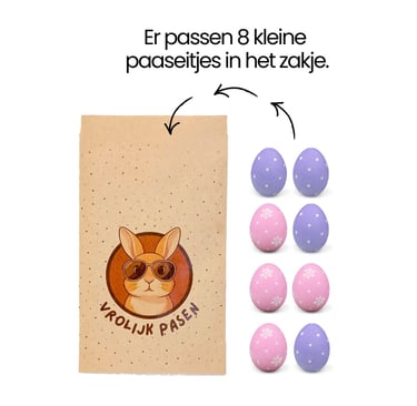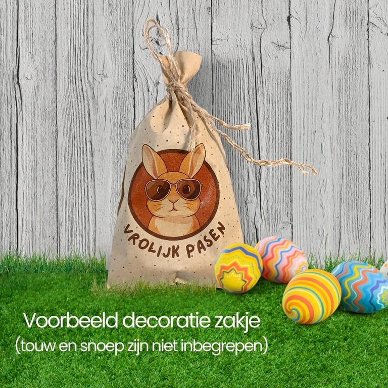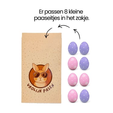 Belangrijk om te weten: dit zijn kleine, platte zakjes. Ze zijn ideaal voor een paar kleine paaseitjes, mini-chocolaatjes of een klein paasgeschenk. Grote chocoladefiguren of volle handjes paaseitjes passen hier niet in.