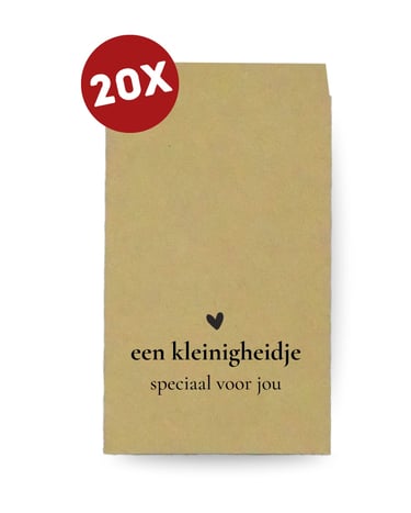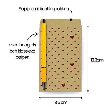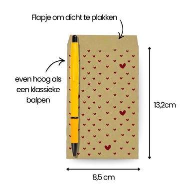 De zakjes zijn gemaakt van bruin kraftpapier en hebben een speels hartjespatroon op de voorzijde. De achterzijde is effen, wat zorgt voor een rustige en stijlvolle uitstraling. Bovenaan zit een praktisch flapje zonder gom of plakstrip, zodat je het zakje eenvoudig kan dichtvouwen of afsluiten met een sticker, lintje of washi tape.