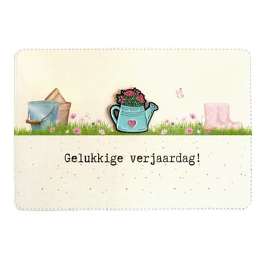 Een hele leuke wenskaart voor de tuinliefhebber. De blauwe gieter met bloemen is een emaille pin die de ontvanger van de kaart op zijn of haar tuinsweater kan spelden.